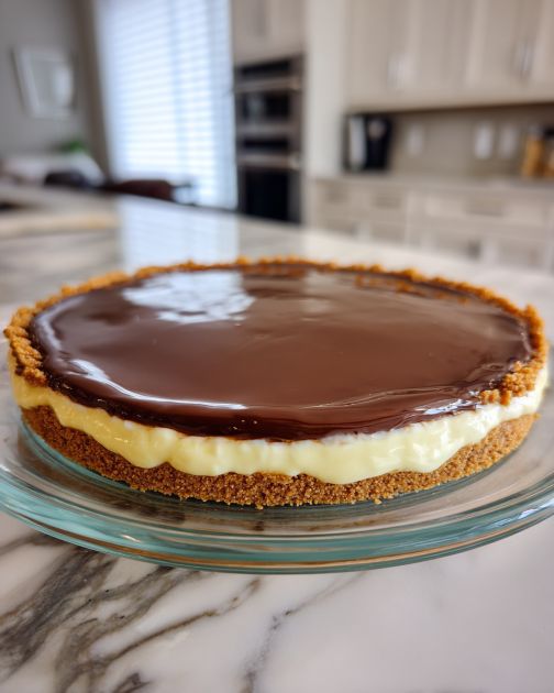 Pour the ganache over the set vanilla cream filling, spreading it evenly. Refrigerate for another hour until the ganache is firm.